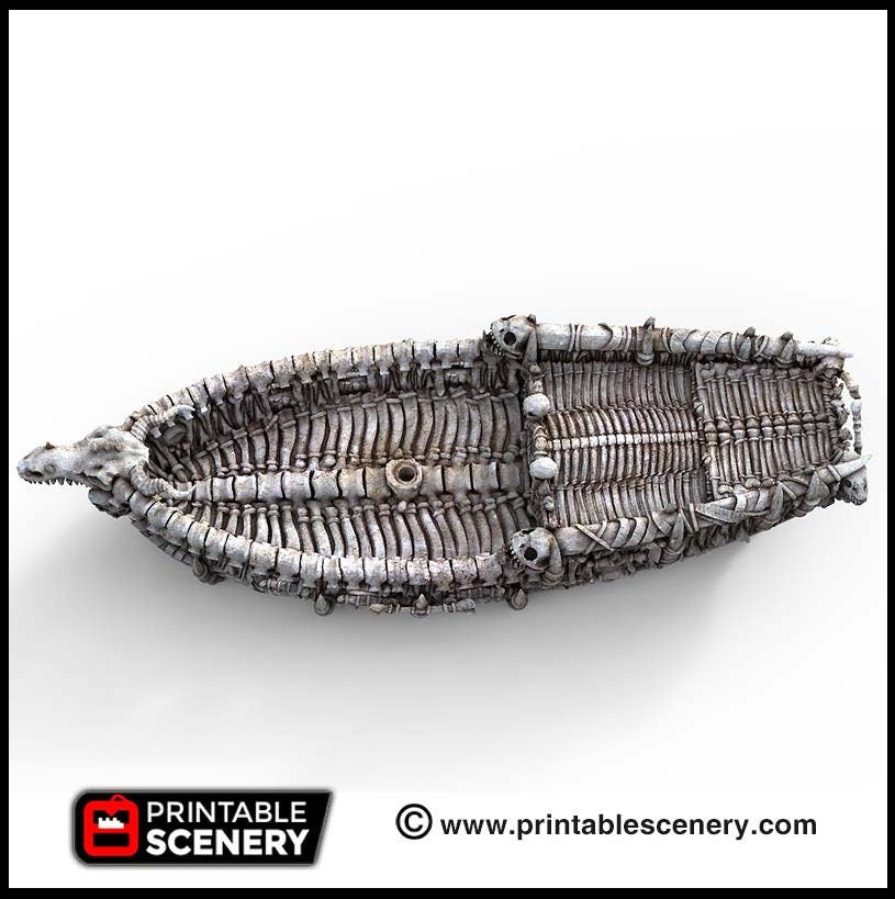 The dreaded bone fleet ships leave many a sailor adrift in a sea of nightmares, and the Undead Sloop is no exception. This iconic vessel, available in two versions with either ballista or cannon armaments, is a must-have for any fantasy RPG, pirate, or skirmish tabletop game. Deck layouts and interior fittings, such as barrels and boxes, bring the ship to life.